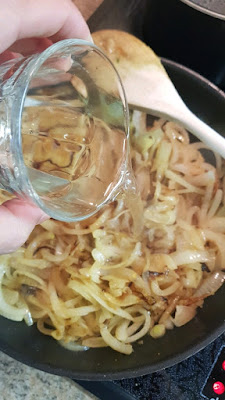 Juntei depois a cebola cortada em fatias de meia-lua e deixei fritar até ganharem cor.